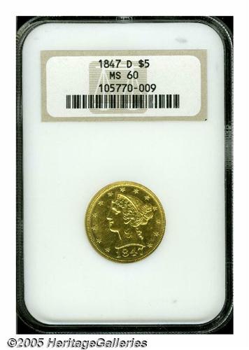 1847-D $5 MS60 NGC. Variety 17-I, from a reverse