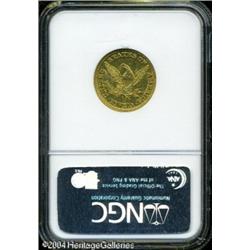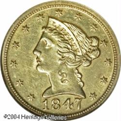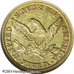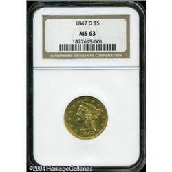 1847-D $5 MS63 NGC. The 1847-D is one of the more <B>1847-D $5 MS63 NGC.</B></I> The 1847-D is one of the more frequently encountered D-mint half eagles, but it is rare in Choice AU and especially in Uncirculated. Only 11-13 Mint State pieces are believed extant today and this coin appears to be the second finest known. This piece may well be the unlocated # 2 coin on the Condition Census in Doug Winter's most recent book on Dahlonega gold. The surfaces have a rich, bright orange-golden coloration and there are remarkably few disturbances on either side--the only ones of note are two planchet defects, one is a small, teardrop-shaped void in the right reverse field, and the other is a rough planchet flake out of the top of the reverse. Well struck throughout. <BR><BR><B>Important notice:</B> Heritage usually auctions material at the rate of 200-250 lots per hour. On some occasions eBay Live bid software or the Internet may not be able to keep up with the pace of the auction. We recommend placing a realistic absentee bid now as insurance to avoid disappointment. Occasionally the auctioneer may eliminate or reject an eBay Live bid, and the auctioneer may also reopen a lot after the close of the eBay live bidding (usually because we missed an audience bid), and may reject your bid even if it shows you as the winning bidder. By bidding via eBay Live, you agree that Heritage may award the lot to another bidder at its sole discretion under the circumstances described above or any other reasonable circumstances. Since eBay bids are not shown to us until we open the lot on the floor, we treat those bids just like floor bids. In most cases the floor responds before the eBay bid is presented to us, due to Internet lag time, so for consistency we have made it a policy that floor bids are always considered first over tie eBay live bids. Also please note that all Heritage lots purchased through eBay Live carry a 20% Buyer's Premium. Please make sure you read the Terms and Conditions before you bid. This lot is being auctioned in conjunction with a live floor auction by Heritage Galleries & Auctioneers. All final auction and invoice information will be supplied by Heritage Galleries & Auctioneers, and all other information should be considered preliminary. Lot:6643
