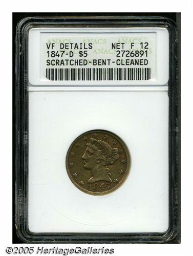 1847-D $5 --Scratched, Bent, Cleaned--ANACS. VF D