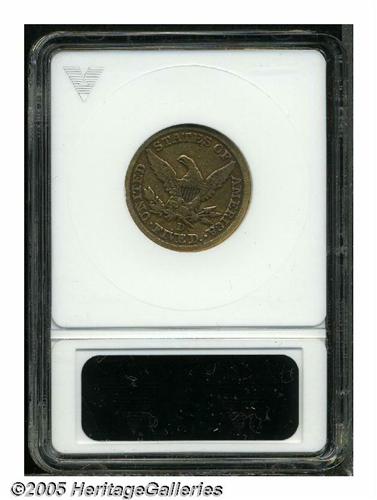 <B>1847-D<$5>--Scratched, Bent, Cleaned--ANACS. VF Details, Net Fine 12.</B></I> Variety 17-I. Golden-brown and lilac colors confirm a past cleaning, and a pair of short, deep pinscratches are near the shield. No bend is readily apparent. About half of the wing feathers are present.
