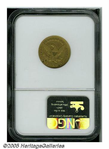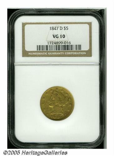 <B>1847-D<$5> VG10 NGC.</B></I> Variety 17-I. An affordable souvenir of this popular Georgian mint, the originality is confirmed by the honey-gold color and a few recessed specks of dirt. The vertical shield lines are still separated, and a few feathers can still be discerned.