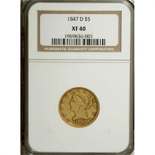 <B>1847-D $5 XF40 NGC.</B></I> Variety 17-I. Few examples of the 1847-D half eagle issue have survived in high grades. Most circulated and many survivors have suffered from mishandling or cleaning through the years. The current example shows well for the grade and issue and would be a welcomed addition to a mid-level collection.<BR><BR><B>Coin Engraver:</B> Christian Gobrecht<BR><BR><b>Shipping:</b> Coins & Currency (<a target="_blank" href="http://www.heritageauctions.com/common/shipping.php">view shipping information</a>)