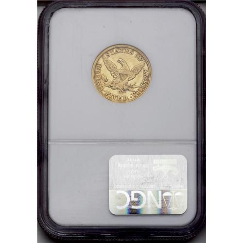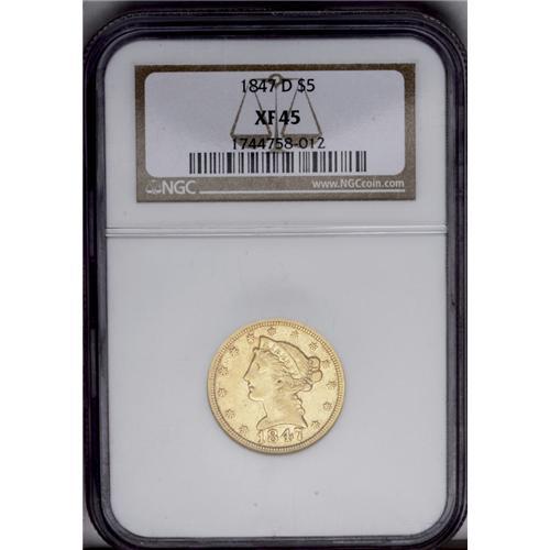 <B>1847-D<$5> XF45 NGC.</B></I> Variety 16-L. One of the more frequently encountered D-mint fives, this piece is typical for the issue with numerous small abrasions scattered over each side. A bit softly struck in the centers, as usual. The bright surfaces show an outline of darker color around the devices and a hint of reddish patina over the otherwise green-gold of the coin.