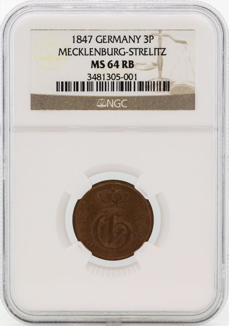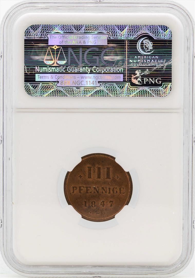 One 1847 Germany 3 Pfennig Coin NGC MS64RB. NGC Certified.
