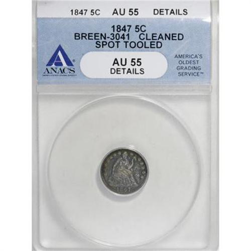 <B>1847 H10C --Cleaned, Spot Tooled--ANACS AU55 Details.</B></I> Breen-3041. NGC Census: (8/134). PCGS Population (7/115). Mintage: 1,274,000. Numismedia Wsl. Price for NGC/PCGS coin in AU55: $96. (#4337)<BR><I>From The Al Blythe Collection of Half Dimes.</B></I><BR><BR><B>Coin Engraver:</B> Christian Gobrecht<BR><BR><b>Shipping:</b> Coins & Currency (<a target="_blank" href="http://www.heritageauctions.com/common/shipping.php">view shipping information</a>)