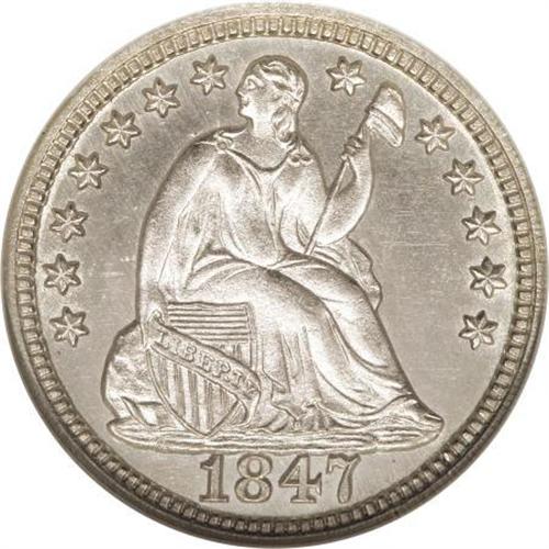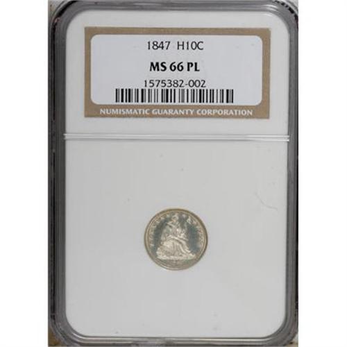 <B>1847 H10C MS66 Prooflike NGC.</B></I> At first glance, this impressive Premium Gem has every appearance of a proof strike. The fields are fully mirrored and exhibit striae usually associated with proof coins from this era. The devices have full mint frost, also common to proofs. With the date high in the field, joining the base of Liberty, and defects near most of the stars, this piece matches Breen's description of the proof variety. All of the design elements are bold, and the surfaces are brilliant with only a hint of ivory color.<BR><BR><b>Shipping:</b> Coins & Currency (<a target="_blank" href="http://www.heritageauctions.com/common/shipping.php">view shipping information</a>)