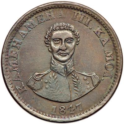 1847 Hawaiian Cent. VF-20 Crosslet 4, 15 berries. The third king of the United Hawaiian Islands, Kamehameha III came to the throne in 1824 and ruled until his death in 1854. His is the only issue of a copper coinage in Hawaii's history as an independent country.
