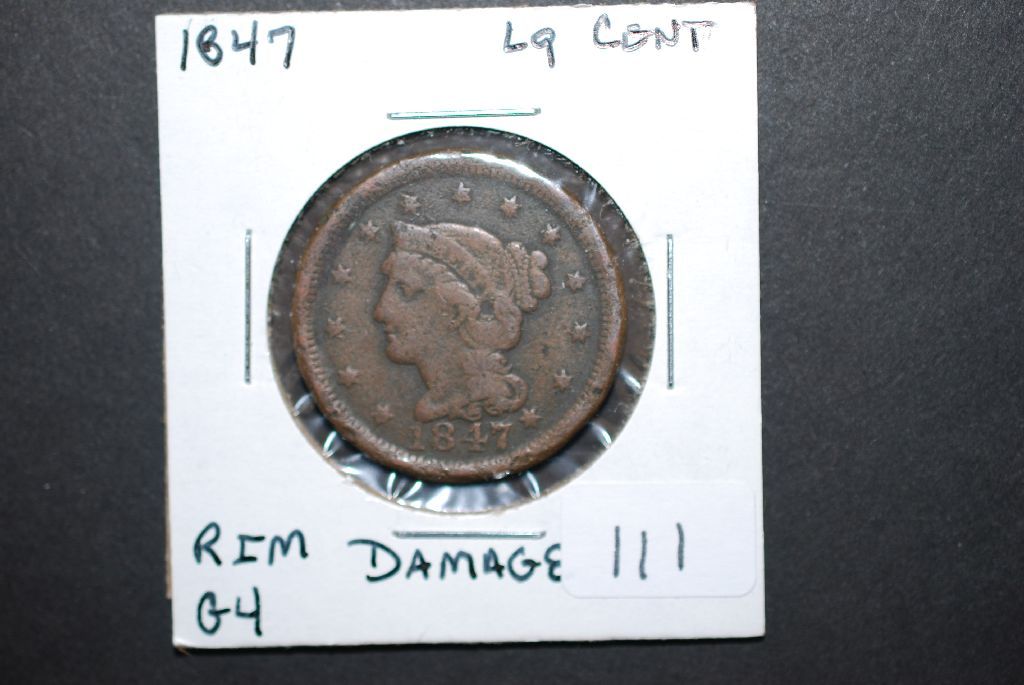 1847 Large One Cent; G4 Rim Damage; EST. $10-20