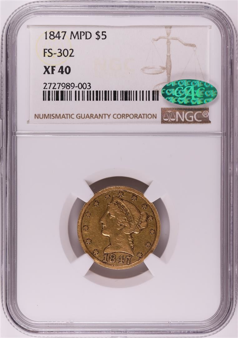 One 1847 MPD FS-302 $5 Liberty Head Eagle Gold Coin NGC XF40 CAC. NGC Certified.