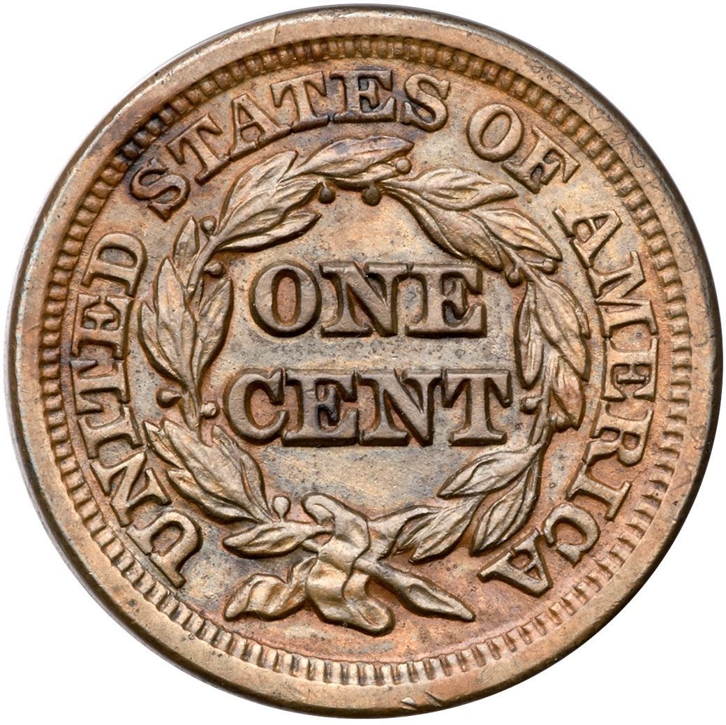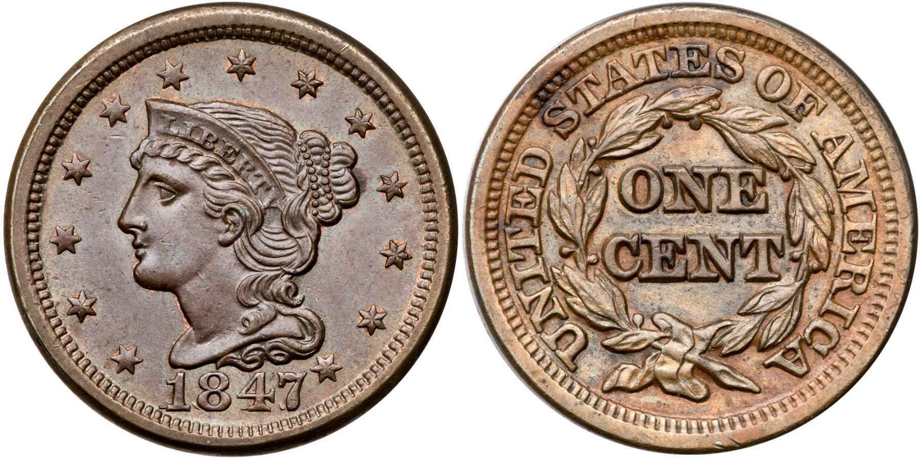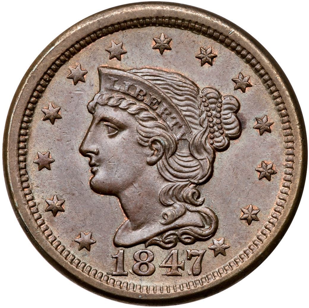 1847 N-1 R-3 AU50+Attractive, mint state obverse with lustrous steel brown and traces of mint red in the protected areas. The reverse is mint state sharpness but cleaned and retoned a mottled olive and golden tan with microscopic roughness. The obverse is lustrous and smooth. E-MDS, with the repunched date sharp. Certificate Number: Pedigree: Ex; RSB 8/1996 - Gary Ruttenberg sale pt II M*G AUctions 8/1996:461 - Superior 2/2000:2199 - Phil Moore
