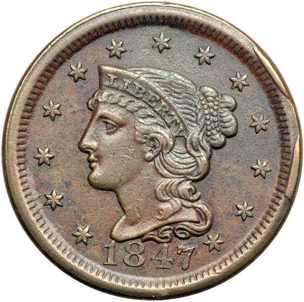 1847 N-11 R4- VF20. Sharpness EF40 with a dull but rather strong scrape on the T in CENT and patches of microscopic roughness on both sides, strongest at stars 7-10. Slightly glossy reddish steel and chocolate brown. Rare LDS, die state c, with strong rim cud breaks at stars 9 & 11. Tied for CC#4 of only 13 known with the two cud breaks. DWH #1254.