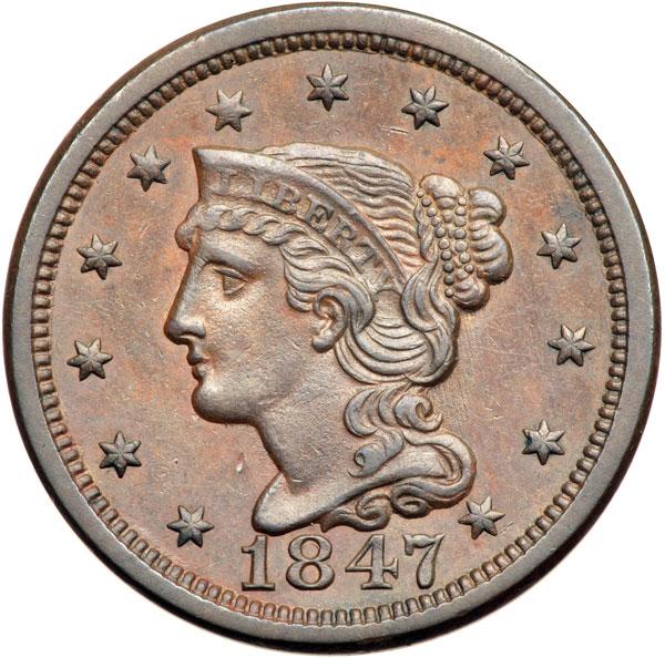 1847 N-12 R3+ Repunched 8 AU50. Glossy reddish chocolate brown with steel brown highpoints and a small splash of darker olive brown toning on the D in UNITED. A tiny nick in the field under the chin is the only mark. Very rare EDS, die state a, with both dies uncracked. The repunching inside the top of the 8 is sharp. Not in the overall condition census for the variety but second finest of the early state. DWH #2522.