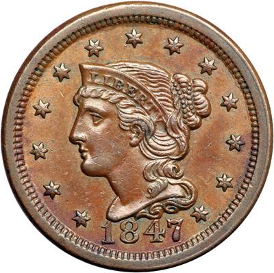 1847 N-15 R4. EF-45. Repunched 7. Glossy medium brown and light chocolate with hints of reddish brown toning on the lower part of the obverse. Sharply struck and free of any notable marks. MDS. The repunching off the right bottom of the 7 is clear. Tied for CC#9.