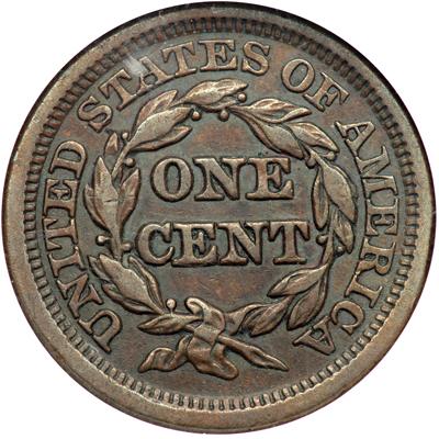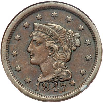 1847 N-18 R5. NGC graded EF-40. Repunched Date, the so-called Large 7 over Medium 7 variety. Glossy chocolate and olive brown. No notable defects, only trivial contact marks consistent with the grade. MDS, before any rim cud breaks on the obverse. The repunching on the date is clear, including the "Medium 7" extending up from the top of the normal "Large 7". Our grade is VF30. The attribution and Large 7 over Medium 7 feature are noted on the NGC label.