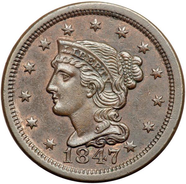 1847 N-20 R3 AU50. Glossy chocolate brown with frosty faded mint red in protected areas. The only notable marks are a couple tiny pinscratches right of star 10. Sharply struck EDS, die state a early. The fields are smooth and slightly reflective, void of any flowlines. (There is no state b for this variety, but the dies develop strong radial flowlines as the dies wear.) DWH #1266.