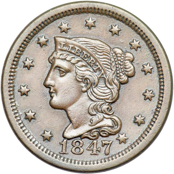 1847 N-20 R3 EF45. Glossy light olive and chocolate brown. Smooth and attractive with only a few trivial marks, including a tiny scratch between stars 1 & 2. Rare EDS with hard, reflective fields on the reverse.