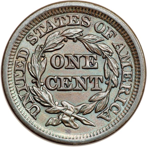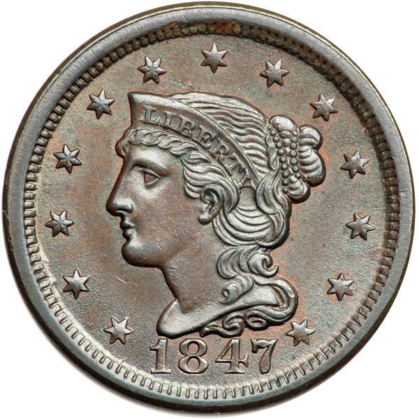 1847 N-20 R3 MS60. Lustrous chocolate brown with overtones of light bluish steel and traces of faded mint color on both sides. Very nice for the grade, nearly flawless. The only defects, and they are trivial, are a tiny planchet flake on the rim over star 10 (as struck) and a spot of slightly darker toning under the ribbon loop at the bottom of the reverse. M-LDS, die state a late. The fields are covered with fine radial flowlines but most of the earlier die lines are still visible.