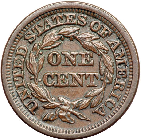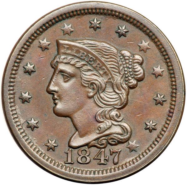 1847 N-21 R1 AU50. Glossy medium brown. Choice except for a tiny nick under star 5, a very faint hairline right of the main curl, and traces of glue or some similar substance in protected areas of the reverse. Sharp EDS, die state a early. The die lines at MERIC are visible and the reverse is uncracked. DWH #1267.