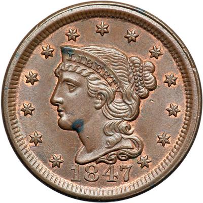 1847 N-21 R1. MS-60. Lustrous steel brown and chocolate with 10% of the original mint red remaining. Choice except for a spot of dark toning on the throat and another at the left top of the L in LIBERTY. Both of these spots has a tiny speck of carbon in the center. LDS, die state b, with a die crack through the top of ME to the dentils on either side (Newcomb's old #40).