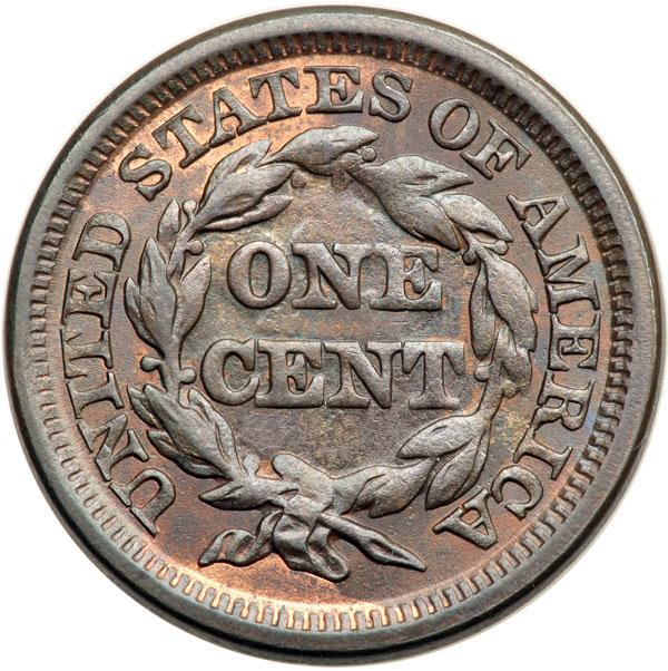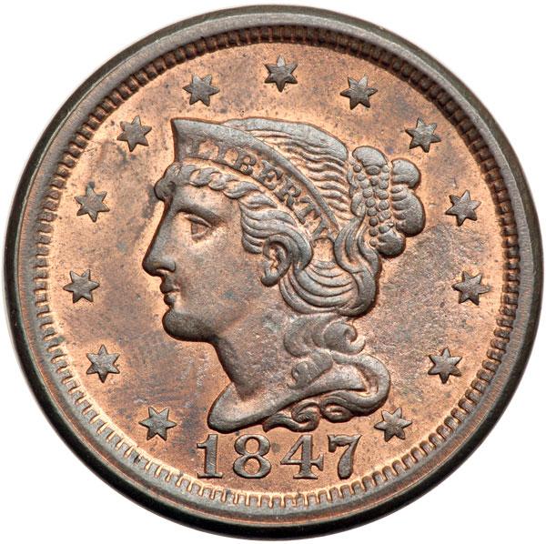 1847 N-24 R1 MS60+. Frosty bluish steel with at least a third of the bright original mint red remaining, mostly on the obverse. Would rate a higher grade but there are shallow low spots covering much of the neck, right obverse field, and the field around ONE CENT, all as struck caused by debris on the dies. Otherwise this cent is choice, virtually free of marks. M-LDS, die state c (Newcomb's old #25). The crack at ME to the dentils over the adjacent letters is clear, the clashmark at the chin is weak but still visible, and traces of the die lines from the inner curl remain visible, although they are weaker than those on the preceding example, perhaps due to the die clogging. This example appears to be slightly later than the preceding one, but the die crack at ICA that differentiates Newcomb's #25 from his #9 has not formed. DWH #2071.