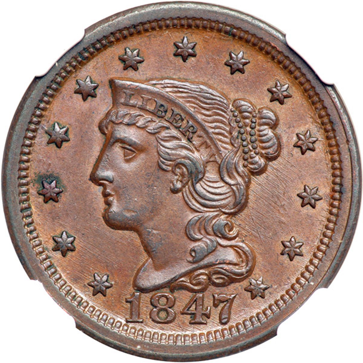 1847 N-24 R1 NGC graded MS63 Brown. Frosty light steel brown with slightly darker steel brown toning on the highpoints. Satiny mint luster covers the protected areas on both sides. The only marks are a couple dull, light ticks on the chin and a dusting of very fine verdigris crud around star 3 and OF. Nicely struck EDS, die state a. Just a hint of friction on the highest points. Our grade is AU55. The attribution is noted on the NGC label.