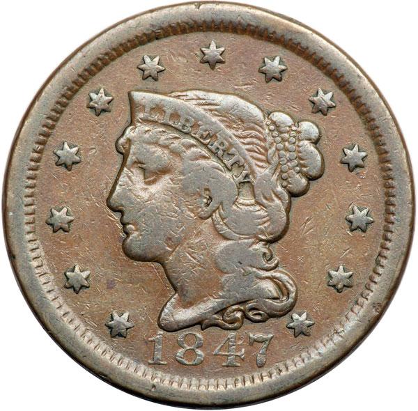 1847 N-26 R3+ VG10. Close to F12 with a few too many light contact marks for the higher grade, including a couple small rim nicks at STA. Attractive glossy light to medium brown with smooth surfaces. Extremely rare terminal die state, die state g, with two separate rim cud breaks at ES in STATES plus the larger one at OF-A. The margins of the three cuds are clear in spite of the relatively low grade. Tied for CC#4 of only 7 known in the terminal state (Newcomb's old N-17 very late). DWH #3233.
