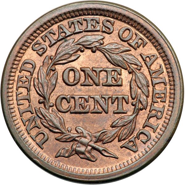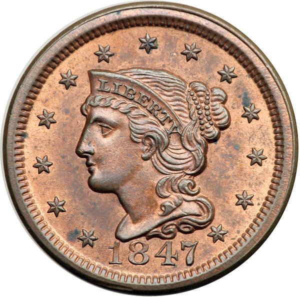 1847 N-27 R4 MS63. Lustrous mint red delicately mellowing to light steel brown on the highpoints, about two-thirds of the original color remaining. Would rate a slightly higher grade if not for a small spot left of star 1, another over star 10, a couple very tiny ticks on the nose, and a barely visible scuff on the neck near the curls. E-MDS, die state b. The reverse is uncracked and the die lines over ERI are gone. CC#2 behind a marginally better piece that has far less original mint color. DWH #2074.