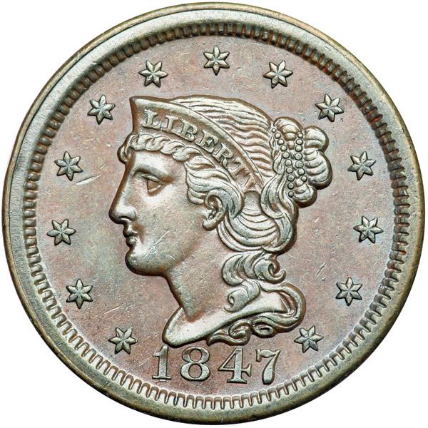 1847 N-27 R4 Repunched 18 EF45. Slightly sharper but there is a very light rim bruise at star 4. Attractive glossy steel brown and light chocolate. EDS, die state a. The fields on the reverse are hard and slightly reflective offering outstanding eye appeal for the grade. The repunching on the 18 is clear.