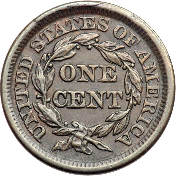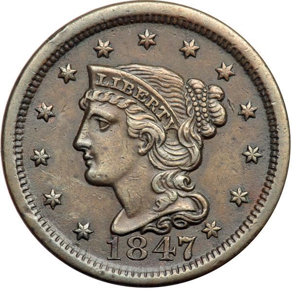 1847 N-28 R4+ VF35+. Glossy light olive and chocolate brown with lighter steel brown highpoints. Smooth surfaces with only a few minor contact marks, including a dull nick on the rim at star 2 and a light rim nick over star 5. Close to EF40. Extremely rare terminal die state, die state f, with a strong rim cud over TATE. Tied for CC#2 of 6 known in the terminal state, this being the discovery coin for the die state. DWH #3235.