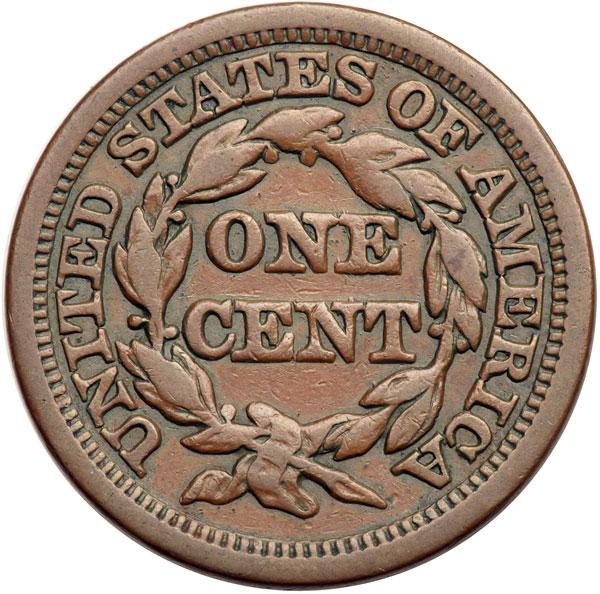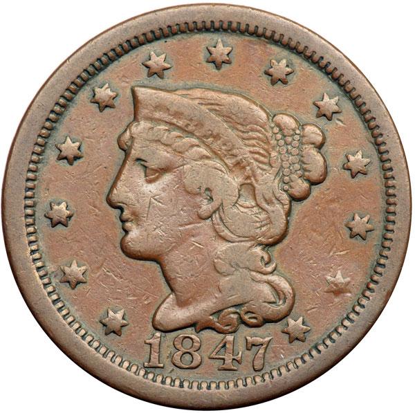 1847 N-29 R3 VG10. Glossy medium brown. Slightly sharper with some light contact marks, including a couple long, thin nicks on the cheek. EDS, die state a, with an uncracked reverse. DWH #1279.