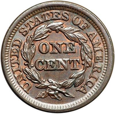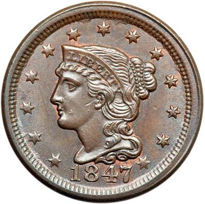 1847 N-3 R3. MS-60. Repunched Date. Very attractive lustrous bluish steel and chocolate brown with generous traces of mint red remaining on both sides. Great eye appeal for the grade, just a few minor contact marks from choice. A light diagonal nick just left of the ear and a pair of fine scratches under EN in CENT are the only notable marks, and they are not distracting. E-MDS, die state b. Clear repunching is visible on all 4 digits of the date and there is a fine die crack at ATE in STATES. Tied for CC#12.