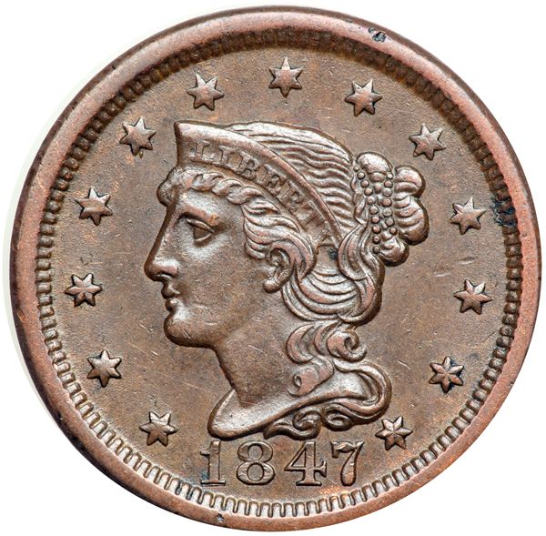 1847 N-30 R4+ EF40. Glossy light chocolate and steel brown with traces of satiny luster in a few of the protected areas. A small rim nick above star 8 is the only notable mark. MDS, die state b. An attractive example of another variety that seldom comes in high grade.