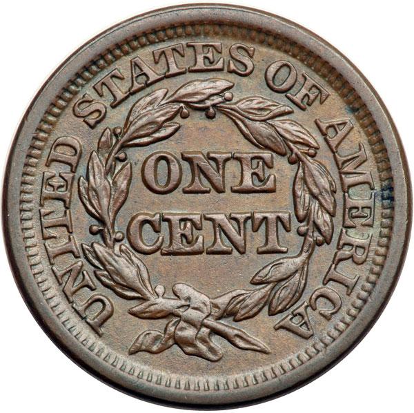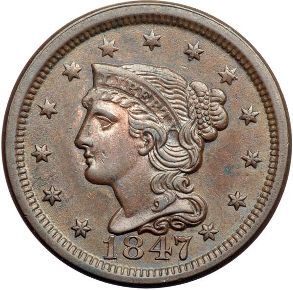 1847 N-30 R4 Repunched 1 AU50+. Glossy steel brown with hints of very faded mint red in a couple protected areas. There are two very tiny ticks just right of the lips and a small splash of darker olive toning in the dentils at ME in AMERICA. Otherwise virtually flawless. MDS, die state b, with a tiny lump on the upper edge of the ribbon loop but no rim cud under the stem end. The repunching under the base of the 1 is clear. Tied for CC#2 honors in the Grellman census. DWH #2077.