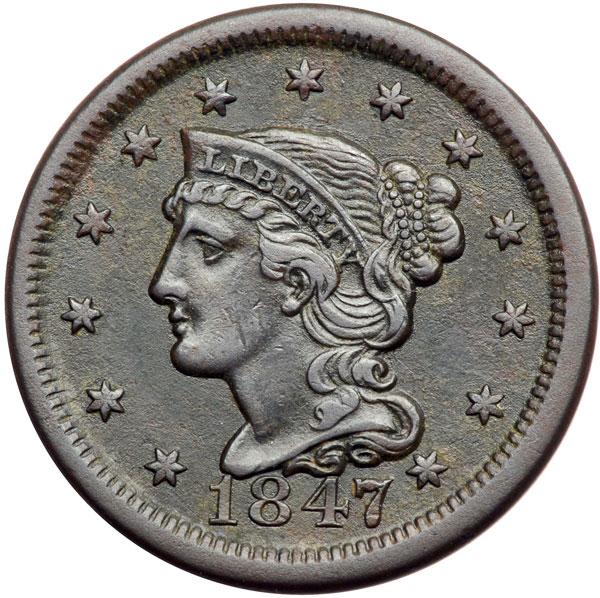 1847 N-32 R4 VF20. Sharpness VF35 but covered with microscopic roughness, strongest in the fields. No marks or other defects. Slightly glossy dark steel and olive brown. Rare LDS, die state f, with a clear rim cud break above TES in STATES. DWH #1285.