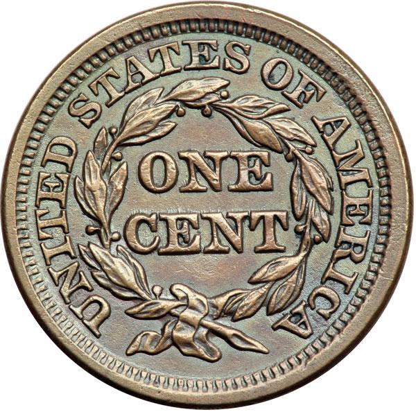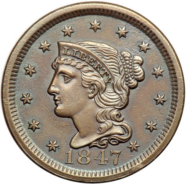 1847 N-36 R6- EF40. Ten points sharper but there is a patch of very fine roughness at stars 8-9 and a dull rim nick or tiny rim bruise under star 13. Lightly cleaned and retoned glossy light bluish steel brown and chocolate with medium brown toning on the highpoints. Frosty mint luster shows in protected areas of the reverse while the obverse is covered with extremely fine sandpaper-like roughness from die rust, as always on this variety. EDS, die state a. The die lines on the reverse are sharp. (There is no state b for this variety.) Tied for CC#2 honors in the Grellman census behind a marginally finer example. Removed from an NCS slab graded Uncirculated details improperly cleaned (NCS label included, and it shows the attribution and Reiver provenance). DWH #2989.