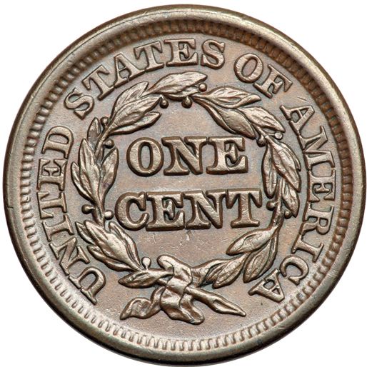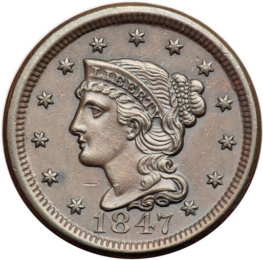 1847 N-38 R1 AU58. Frosty steel brown and chocolate. Just a hint of friction on the highest points from mint state. The only marks are a thin horizontal nick in the field under the chin and a spot of darker olive brown toning nestled against the right side of star 2. M-LDS, die state d, Newcomb's old #16. The die lines from the inner and main curls are gone and a die clashmark shows at the bottom of the neck.