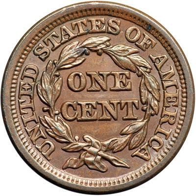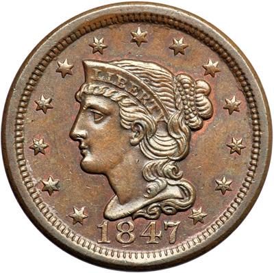 1847 N-38 R1. AU-58. A very attractive, lustrous cent with mint state eye appeal. Just a hint of friction on the highest points and a few microscopic contact marks, including a tiny pinprick under the earlobe and another near the dentils under star 4. Lustrous light chocolate and steel with traces of faded mint red showing on both sides. Sharply struck E-MDS, die state b, with faint waves at D and ST. The die lines at the inner curl are sharp. Removed from an NGC slab graded MS63 Brown (NGC label included).