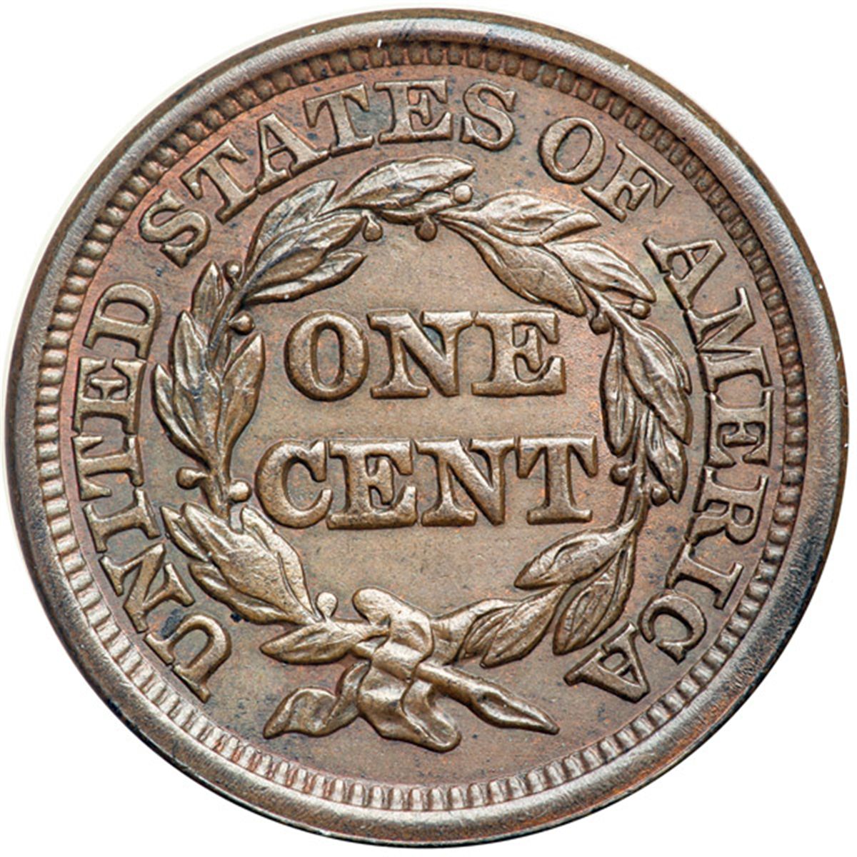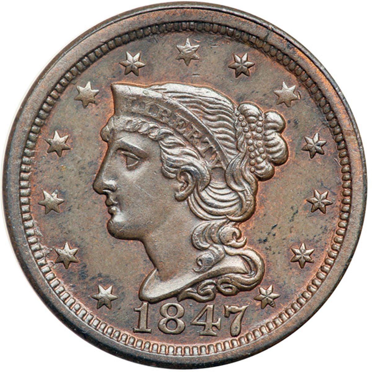 1847 N-6 R1 AU58. Frosty steel brown and olive with traces of mellowed mint color remaining in protected areas, especially on the obverse. Would rate a mint state grade if not for tiny spots of dark olive toning scattered over both sides. The best identifying mark is a tiny vertical nick at the right point of star 9. Rare EDS, die state a, with repunching at the left end of the base of the 4.