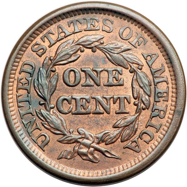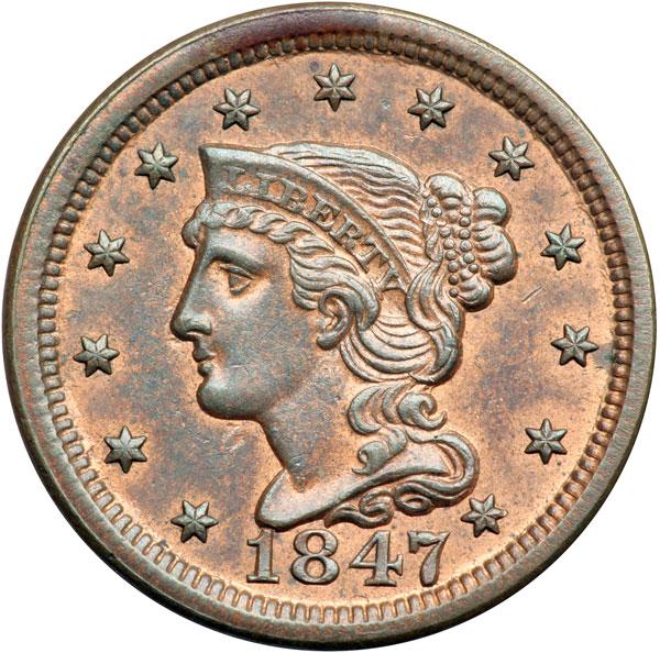 1847 N-6 R1 MS63. Mint red toning down to steel brown, nearly half the original color remaining. There is a tiny tick in the field under the outer hairbun, a small spot of darker steel toning at the dentils right of star 11, and a swipe of darker steel toning at NITED. MDS, die state b. The repunching left of the base of the 4 is gone but the die line down from the dentils at star 6 is sharp. Tied for finest known honors with three other pieces. DWH #2063.