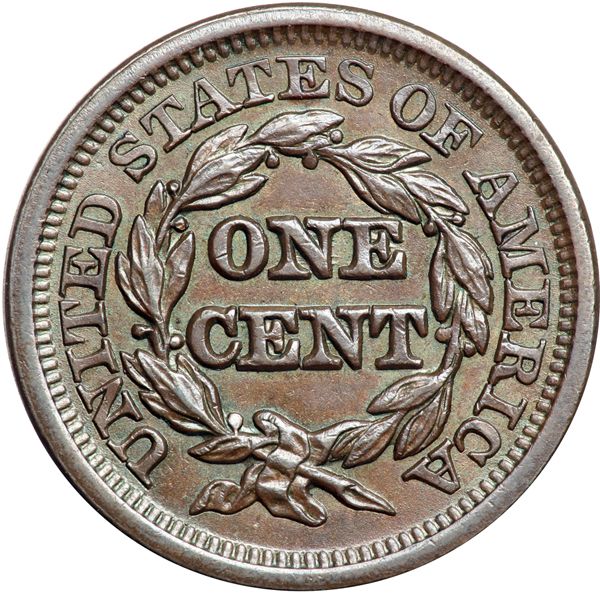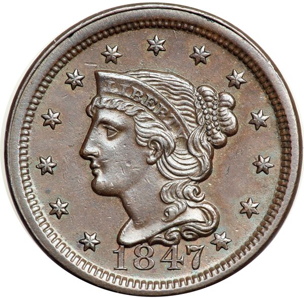 1847 N-7 R2+ AU50+. Choice glossy steel brown and chocolate. Frosty luster covers the protected areas on both sides. Just a few trivial ticks from flawless. MDS, die state a.