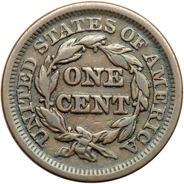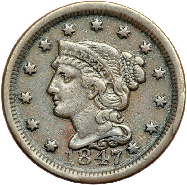 1847 N-7 R2+ F15. Sharpness near VF20 with some light contact marks on the obverse. None of these marks is distracting, but there are too many for the higher grade. A tiny pinprick on the cheek right of the nostril is a good identifying mark. Glossy light olive and chocolate brown. LDS, die state d or e. There is a clear rim cud break at stars 11-12 and another slightly less obvious one from under the 18 in the date to star 1. There may have been another rim cud at stars 2-3, but the rim is thin and worn in that area so the presence of that rim cud is uncertain. CC#2 of only 3 known in die state d, but a cud at stars 2-3 would make this the much more common die state e, which is quite possible. Reiver thought it was state d. Removed from an NCS slab graded EF details improperly cleaned (NCS label included, and it shows the attribution and Reiver provenance). DWH #2980.