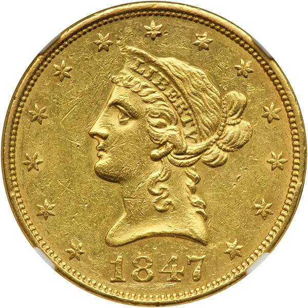 1847 NGC graded AU Details. Improperly cleaned. Mostly untoned. Important No Motto Type issued in 1838-66 (PCGS # 8597) .