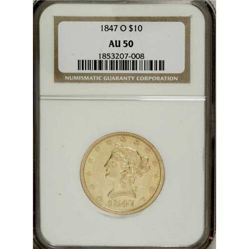 <B>1847-O $10 AU50 NGC.</B></I> NGC Census: (87/290). PCGS Population (79/59). Mintage: 571,500. Numismedia Wsl. Price for NGC/PCGS coin in AU50: $480. (#8598)<BR><BR><b>Shipping:</b> Coins & Currency (<a target="_blank" href="http://www.heritageauctions.com/common/shipping.php">view shipping information</a>)