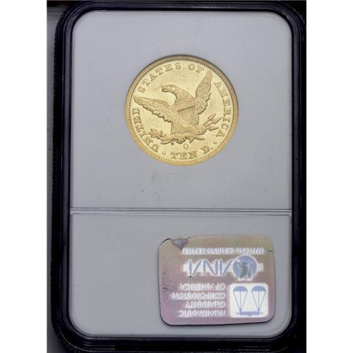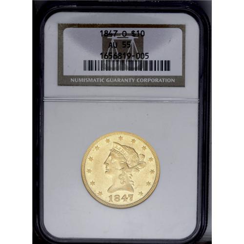 <B>1847-O<$10> AU55 NGC.</B></I> A clean straw-gold example of this popular O-mint No Motto issue. Bright luster illuminates borders and devices. Slightly soft on portions of the curls and eagles. The dies are moderately rotated.