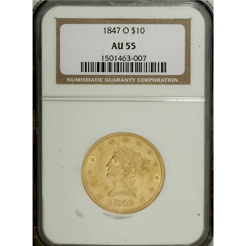 <B>1847-O $10 AU55 NGC.</B></I> Breen-6881, "Very rare." The 18 in the date is repunched south. This pale gold piece has a couple of trivial rim nicks, but is generally smooth for the grade overall. The reverse displays an intricate network of die cracks, as made.<BR><BR><b>Shipping:</b> Coins & Currency (<a target="_blank" href="http://www.heritageauctions.com/common/shipping.php">view shipping information</a>)