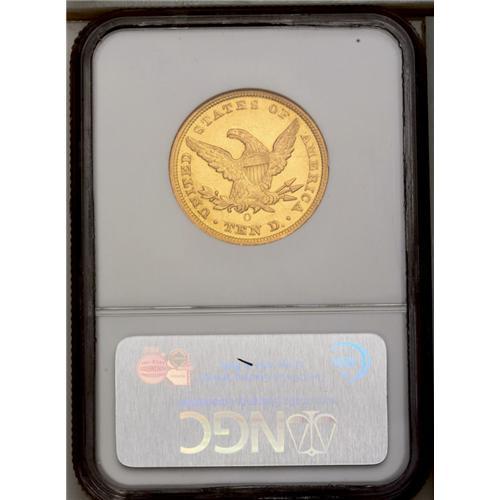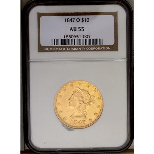 <B>1847-O<$10> AU55 NGC.</B></I> The bases of the 18 in the date are repunched. Ample luster resides in the recesses of this peach-gold New Orleans issue, and the design elements display above-average definition, though the hair at Liberty's ear is smooth. Minor marks scattered about do not distract.