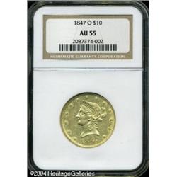 1847-O $10 AU55 NGC. The surfaces have assumed a y <B>1847-O $10 AU55 NGC.</B></I> The surfaces have assumed a yellow-gold color, and display traces of luster in the protected areas. Liberty's hair above the ear is soft, and some of the star centers are weak, but overall the design features are well defined. A few light abrasions are scattered about each side. <BR><BR><B>Important notice:</B> Heritage usually auctions material at the rate of 200-250 lots per hour. On some occasions eBay Live bid software or the Internet may not be able to keep up with the pace of the auction. We recommend placing a realistic absentee bid now as insurance to avoid disappointment. Occasionally the auctioneer may eliminate or reject an eBay Live bid, and the auctioneer may also reopen a lot after the close of the eBay live bidding (usually because we missed an audience bid), and may reject your bid even if it shows you as the winning bidder. By bidding via eBay Live, you agree that Heritage may award the lot to another bidder at its sole discretion under the circumstances described above or any other reasonable circumstances. Since eBay bids are not shown to us until we open the lot on the floor, we treat those bids just like floor bids. In most cases the floor responds before the eBay bid is presented to us, due to Internet lag time, so for consistency we have made it a policy that floor bids are always considered first over tie eBay live bids. Also please note that all Heritage lots purchased through eBay Live carry a 20% Buyer's Premium. Please make sure you read the Terms and Conditions before you bid. This lot is being auctioned in conjunction with a live floor auction by Heritage Galleries & Auctioneers. All final auction and invoice information will be supplied by Heritage Galleries & Auctioneers, and all other information should be considered preliminary. Lot:6730