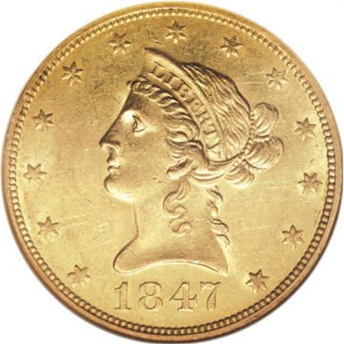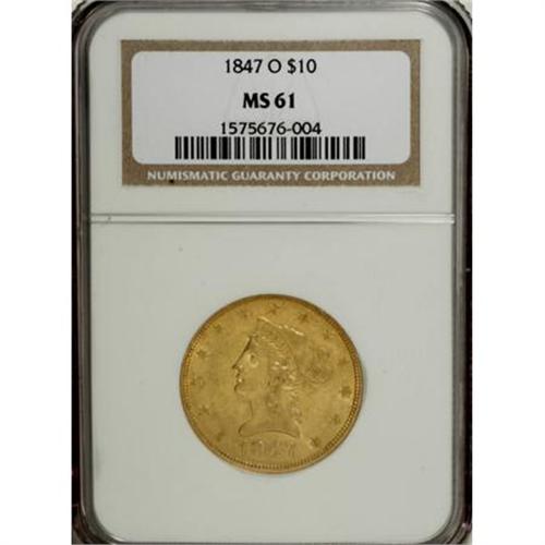 <B>1847-O $10 MS61 NGC.</B></I> This early New Orleans issue's liberal mintage, well over a half million pieces, accurately forecasts its comparative obtainability in XF and AU condition. Few were spared from circulation, however, as demand for gold in the country's heartland remained very strong in the years leading up to the Civil War. This scarce Mint State representative displays average or better sharpness and, while not heavily abraded, has a uniform scuffiness in the fields that subdues the satiny luster. Census: 12 in 61, 3 finer (6/07).<BR><BR><B>Coin Engraver:</B> Christian Gobrecht<BR><BR><b>Shipping:</b> Coins & Currency (<a target="_blank" href="http://www.heritageauctions.com/common/shipping.php">view shipping information</a>\)