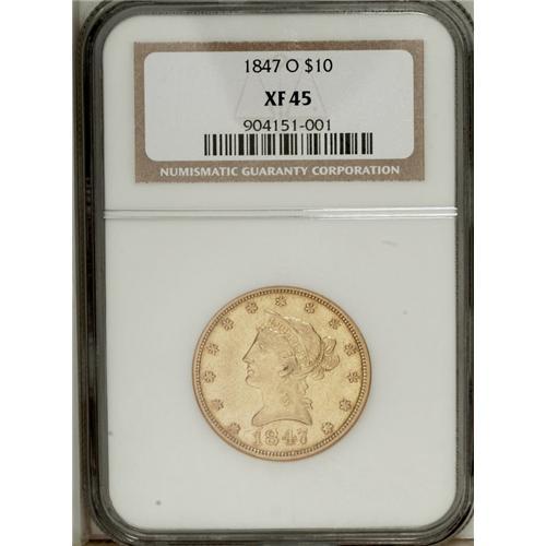 <B>1847-O<$10> XF45 NGC.</B></I> Light, even wear is apparent on both sides. The lemon-yellow surfaces, which have light marks from circulation, retain a trace of original mint luster.
