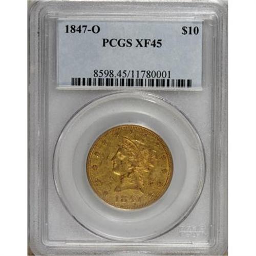 <B>1847-O $10 XF45 PCGS.</B></I> PCGS Population (107/140). NGC Census: (140/386). Mintage: 571,500. Numismedia Wsl. Price for NGC/PCGS coin in XF45: $405. (#8598)<BR><BR><B>Coin Engraver:</B> Christian Gobrecht<BR><BR><b>Shipping:</b> Coins & Currency (<a target="_blank" href="http://www.heritageauctions.com/common/shipping.php">view shipping information</a>)